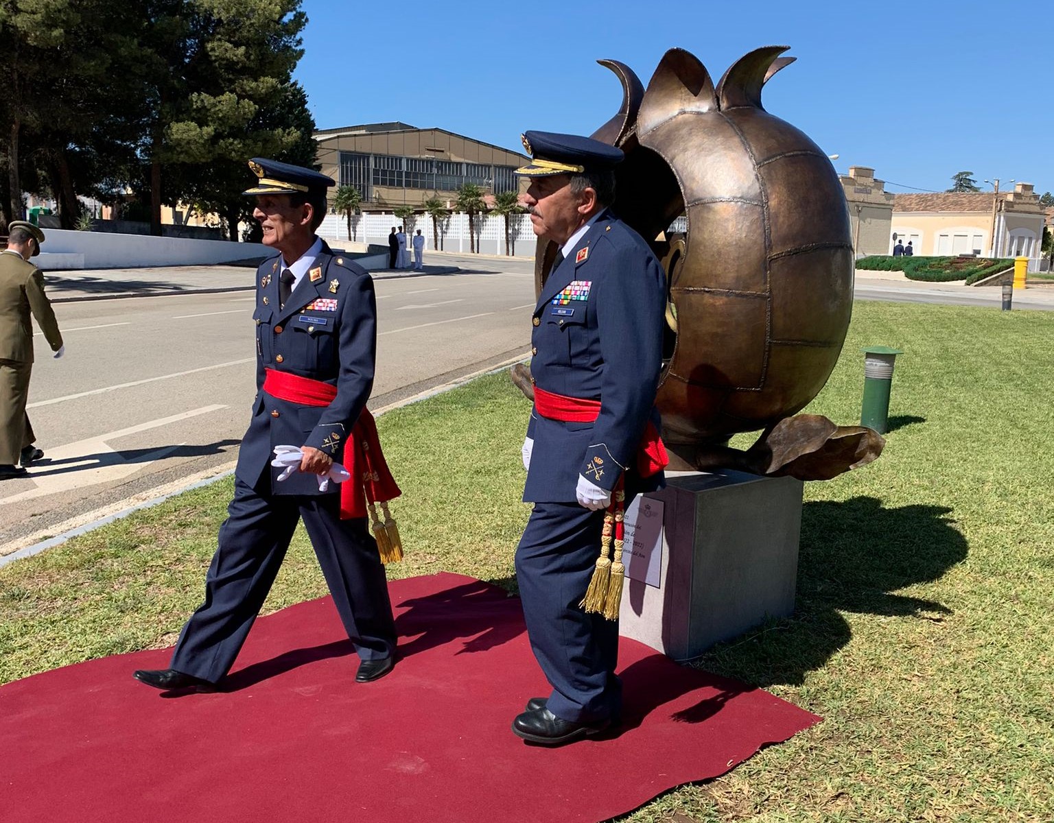 En torno a las once de la mañana, la comitiva llevó a cabo la inauguración del monolito conmemorativo del centenario de la Base Aérea de Armilla, realizado por Espacio de Arte Hnos. Moreno que representa una granada y en la que su ‘corazón’ se destaca el centenario, además de en la placa conmemorativa grabada sobre la base.